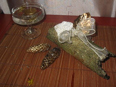 Подкрасив также пару бумажных салфеток, кладем их на журнальные столик. Туда же ставим любую стеклянную емкость - пепельницу, глубокое блюдце, вазочку, пиалу - все, что есть у вас на даче. Наливаем туда воду и бросаем бусины от бус - столько, сколько покажется вам красиво. Сверху пускаем плавать пару звездочек или снежинок с мишуры, их и отрезать порой не надо, сами осыпаются, а мы, не продумав, как можно использовать выкидываем. Золотим маленькую свечку и пускаем плавать по поверхности. Рядом кладем пару шишек и несколько еще бусин и звездочек.