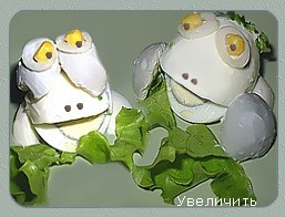 Они сделаны из яиц, глаза из половинок желтка или колечек лука, зрачки - сладкая кукуруза. Лук можно заменить кружочком свежего овоща: огурца, редиса, моркови. На листьях салата такая компания смотрится очень мило и аппетитно. Если это обед, то спинки лягушат можно полить майонезом и посыпать луком или зеленью. Тривиальное, привычное по общепиту блюдо "Яйцо под майонезом с одиноким ломтиком огурца" примет другую форму и внесет разнообразие:)
