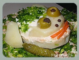 Это второй вариант украшения вашего салата или самостоятельного блюда для ребенка. Если вы празднуете детский день рождения и лягушонка торжественно снимете с вершины салатной горки и вручите имениннику, то вряд ли он его не попробует. Здесь использован холодный отварной картофель. Картофелина варится в мундире, охлаждается, (сварите для оливье всего лишь одну лишнюю картофелину), затем разрезается пополам и из каждой половинки ложкой выскребается сердцевина, чтобы получилась лодочка. Внутрь каждой половинки кладем начинку (этот же самый салат или все, что вашей душе угодно!!), соединяем половинки вместе. Лапки - из кусочка картошки и огурца, глаза - половинки оливки, рот- морковка или болгарский перец, на спинке: майонез с зеленью.