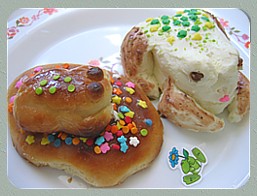 Если ваш малыш ну никак не хочет есть в Светлое Воскресенье приготовленные вами кулич и пасху, а вы так старались, готовили блюда с любовью и освещали, то может попробовать предложить ему детский вариант? Идея может сработать и если юная помощница дочка крутиться во время приготовления праздничного стола для всей семьи на кухне и стремится помочь. Выделите ей часть материала, замесите немного теста покруче, чтобы ребенок мог лепить. Я думаю, что то, что ему доверено столь ответственное задание, очень понравится малышу, и вам никто не помешает. А потом малыш с радостью пойдет с вами в церковь, чтобы лично освятить приготовленные им угощения. И уж тогда точно съест. Творожная масса, используемая в приготовлении пасхи, если не делать ее жидкой лепится руками и можно придать любую форму - лягушонка например. А из теста можно вылепить печенье в форме яиц с веселыми лягушатами. Если овальное печенье покрыть белой глазурью то получатся почти настоящие яички, только сладкие, от которых ребенок не откажется. Все как всегда зависит от вашей фантазии. И умения тут нужно минимум. Даже если его совсем нет в магазине можно купить творожную массу и готовое, замороженное тесто для выпечки, остальное сделает за вас малыш:)