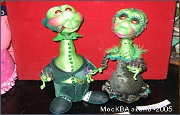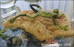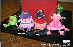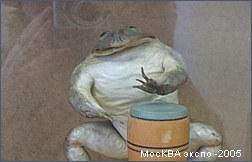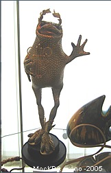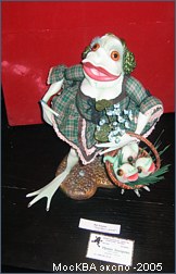 Куклы были особенно потрясающими. Может быть потому что этот вид искусства был всегда для меня слишком сложен для попытки повторить:) Чудесные экспонаты. Думаю, что те, кто может позволить себе иметь такую роскошь в коллекции, купив любую из них не прогадают. Много было замечательных экземпляров представленных коллекционерами: тут и старинные открытки, и посуда, и лягушки, привезенные из путешествий. Были точно такие же как есть у меня, были такие, какие хотелось бы иметь. Было приятно осознать, что оказывается и у меня в шкафчике есть кое-какие экземпляры, аналогов которых мне не удалось найти в витринах, а значит тоже есть чем похвастаться при случае. Фотографировать все коллекции было просто невозможно, я сделала несколько общих снимков для себя. А тут размещаю наиболее запомнившийся и лакомый для меня экспонат. Это чучело натуральной лягушки. Лягушка играет на бубне. Смотрится очень необычно и оригинально. Может быть защитники животных сочтут эту композицию жестокой, но я бы лучше посоветовала бы им заглянуть во французские рестораны для начала, а потом уже ополчиться на коллекционеров. По крайней мере этот музыкант будет радовать взоры многие годы, а о съеденных лягушачьих лапках мы забываем уже через несколько часов. Я бы хотела иметь нечто подобное в своем собрании и берегла бы такое сокровище. Возможно где-то в тропических странах это недорогой обычный сувенир, но в моих глазах это великая ценность.