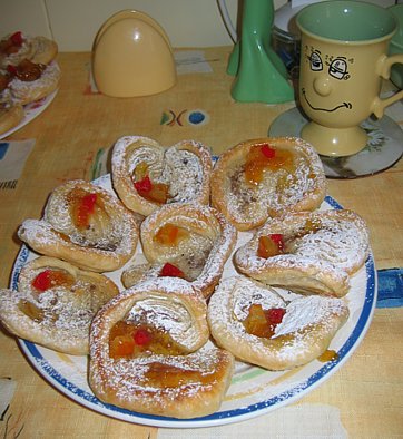 Купите (или приготовьте сами) два пласта слоеного теста (лучше без дрожжевого). Разморозьте полностью(можно купить накануне и выложить утром перед работой в холодильник) так, чтобы пласты не слиплись. На посыпанный мукой стол положите один пласт теста. Смажьте его растопленным сливочным маслом, смешанным с сахарным песком. Раскатайте оба пласта. Нанесите еще один слой смазки, добавьте корицу, ваниль, другие любимые пряности. Затем сложите тесто от краев к середине так, чтобы "шов" получился аккуратно посередине. Заверните края еще раз к центру, чтобы свиток напоминал рулет, который при разрезе на кусочки даст крендельки. Разрежьте рулет на отдельные печенья и разложите их на противень, хорошо, если у вас есть пергамент. Выпекайте до зарумянивания, переверните каждое печенье на другую сторону и подержите еще чуть-чуть в духовке. Не экономьте на пропитке, чтобы тесто не вышло очень сухим. Пропитывать можно также медом с маком, не жидким джемом. Посыпьте сахарной пудрой, украсьте всем, что вы любите и имеет под рукой. Можно развести сахарную пудру соком лимона до консистенции и цвета сметаны и покрыть печенья, сверху украсить сахарными сердечками или сердечками их желе. Импровизируйте!Лакомого вам праздника!!!!
